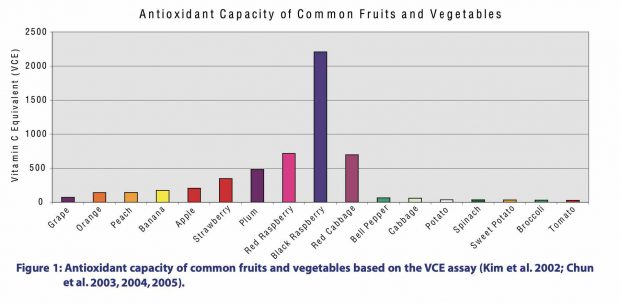 “Black raspberries are an excellent source of antioxidants in the human diet. With 10 or more times the antioxidant capacity than many other fruits and vegetables, even a small quantity of black raspberries added to the diet can significantly increase total antioxidant consumption. As few as four average sized berries (2.5 g each) has a greater antioxidant capacity than 100g (3.5 oz.) of many fruits and vegetables. With this level of antioxidant power, black raspberries can be an affordable, low calorie source of antioxidant in anyone’s diet.”